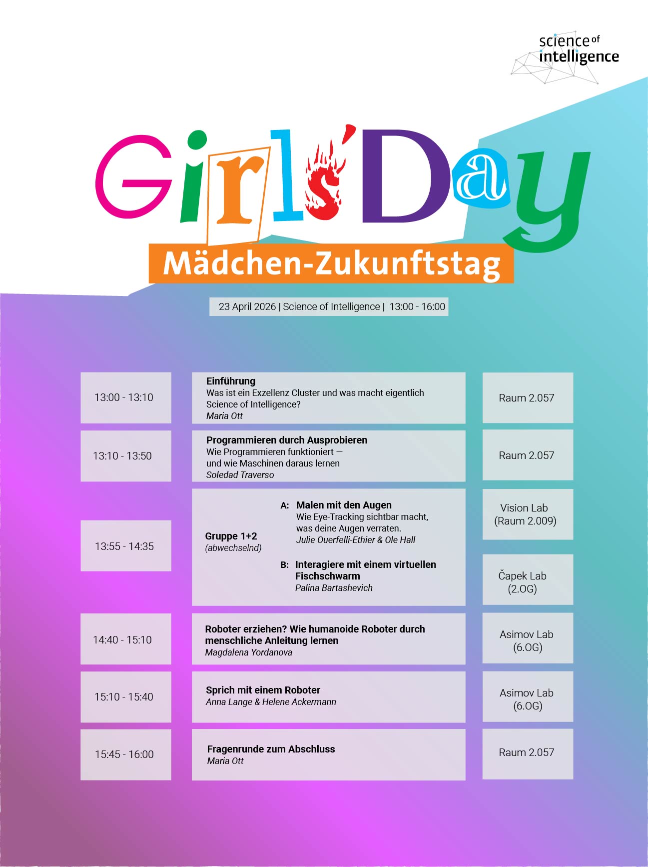 What is intelligence, and how can research help improve current technologies with new insights? At Girls’ Day with the Cluster of Excellence Science of Intelligence, you’ll discover how scientists from many different disciplines explore the topic of intelligence.